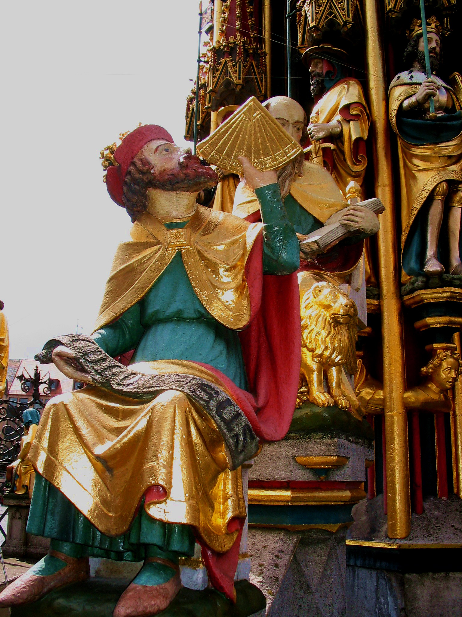 Am Beckenrand befinden sich 16 Figuren. Die acht außen sitzenden kleineren Gestalten stellen die Philosophie und die sieben Unterrichtsfächer der mittelalterlichen Schule dar. Pythagoras vertritt die Musik, Euklid die Geometrie, Ptolemäus die Astronomie, Nikomachos das Rechnen. Cicero ist Symbol für die Redekunst, Donatus für die Grammatik und die letzte Figur soll die sogenannte Dialektik darstellen, die Kunst des logischen Denkens und Schreibens, Sokrates sitzt dabei, um die Zahl acht voll zumachen. Im Bild ist Ptolemäus zu sehen, der mit einem kleinen Quadranten eine Vermessung vornimmt.
